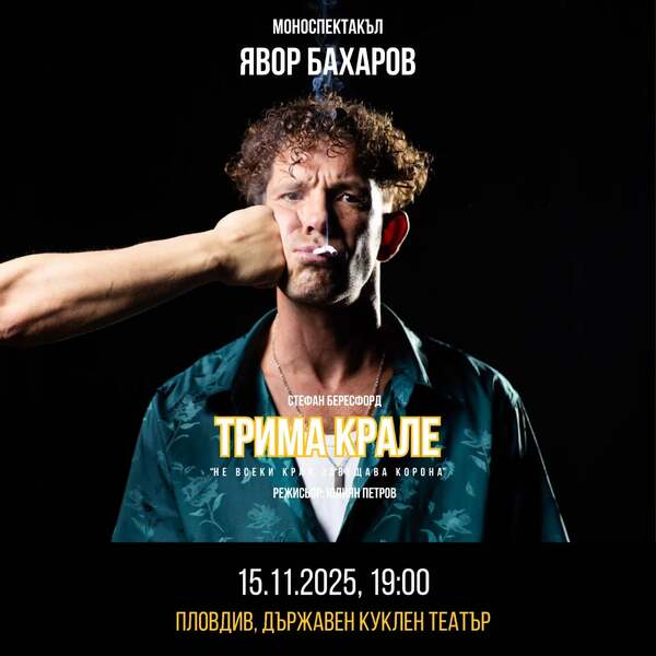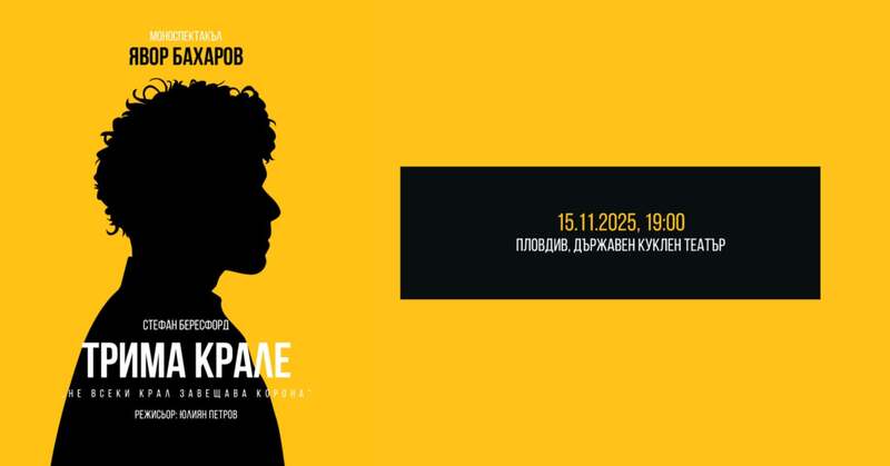 Актьорът Явор Бахаров представя един необичаен и дълбоко личен моноспектакъл по пиесата на британския драматург Стефан Бересфорд. Премиерата на „Трима крале“ в Пловдив е на 15ти ноември на сцената на Държавен куклен театър и е част от програмата на тазгодишното издание на Нощ на театрите.